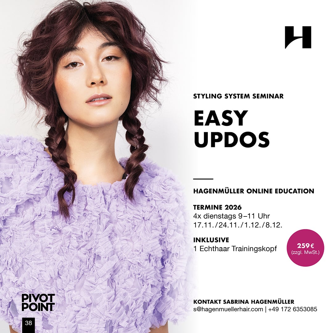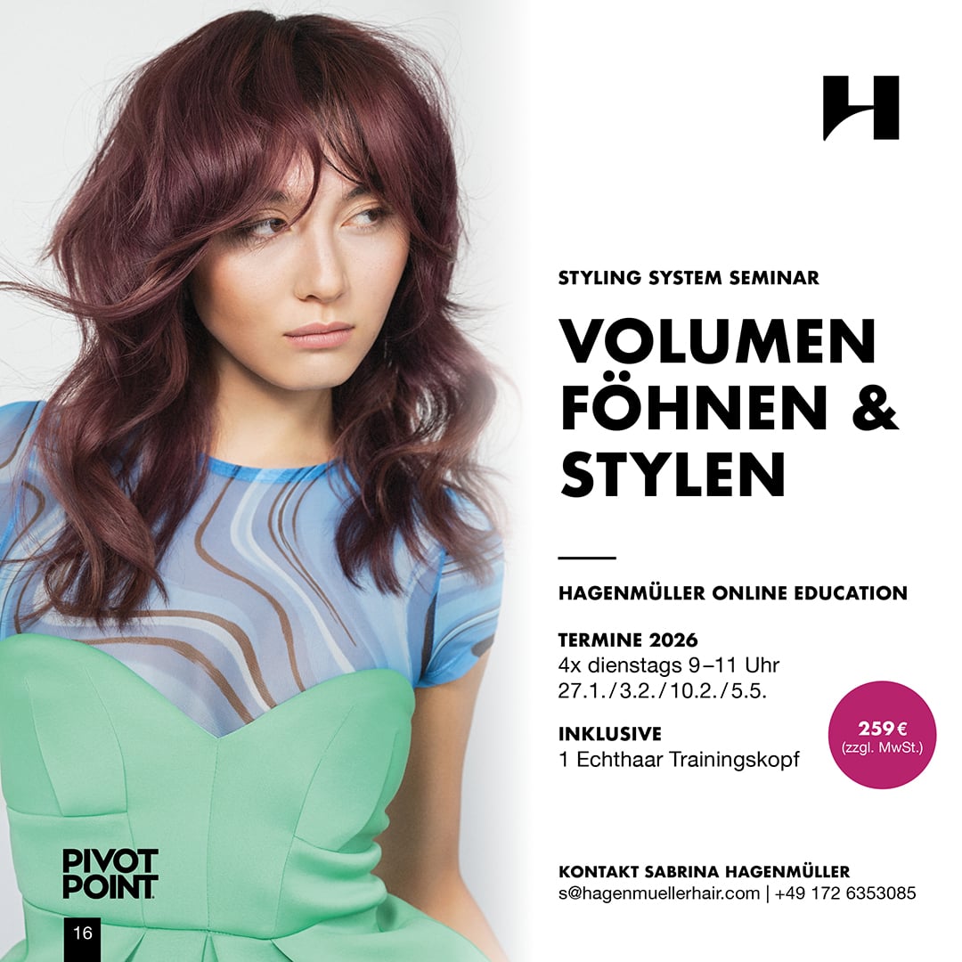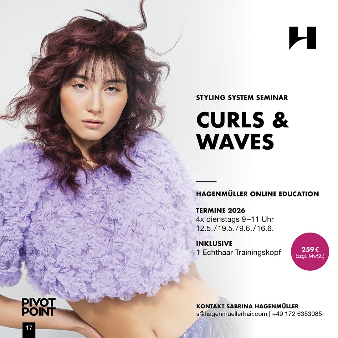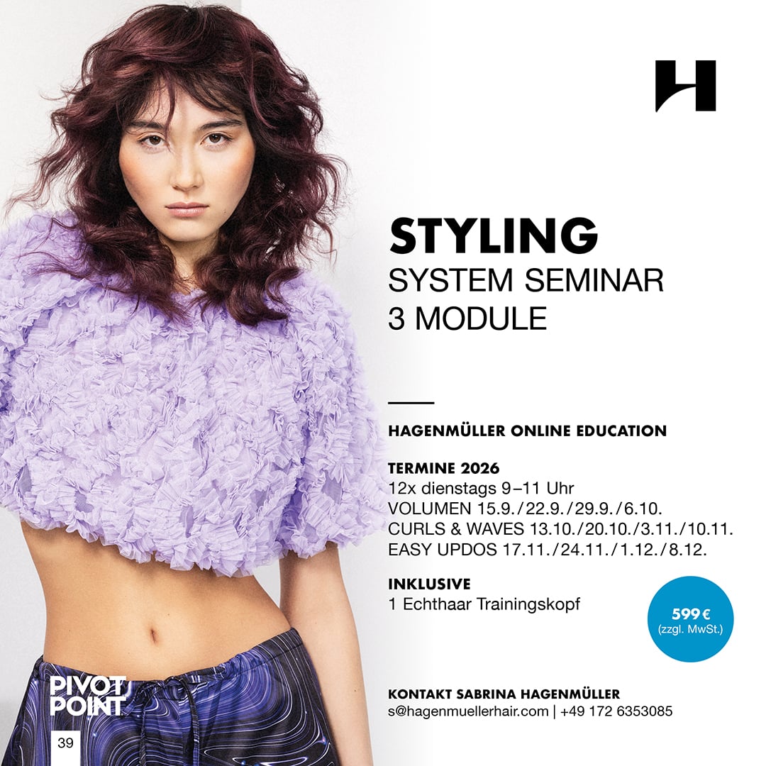 Für alle, die Styling lieben und wissen, dass sie immer dazu lernen können, um ihr Reportoire zu erweitern. Vom schnellen Föhnstyling, moderne Rundbürsten Techniken, alle Glätteisen und Lockeneisenvarianten und die gezielte Umsetzung der Abteilungen und Winkel, um auch gezielt das gewünschte Ergebnis zu erreichen.